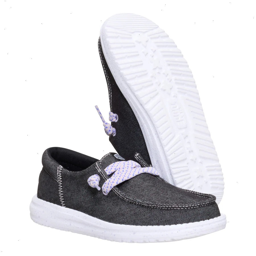 These Wendy shoes for big kids look like feet jeans and feel like little clouds underfoot. Classic denim textile and a speckled sole craft a fun, classy profile. A wide collar and signature HEYDUDE™ elastic laces make them super easy to step into. The best part is they fit snugly without having to tie the laces.